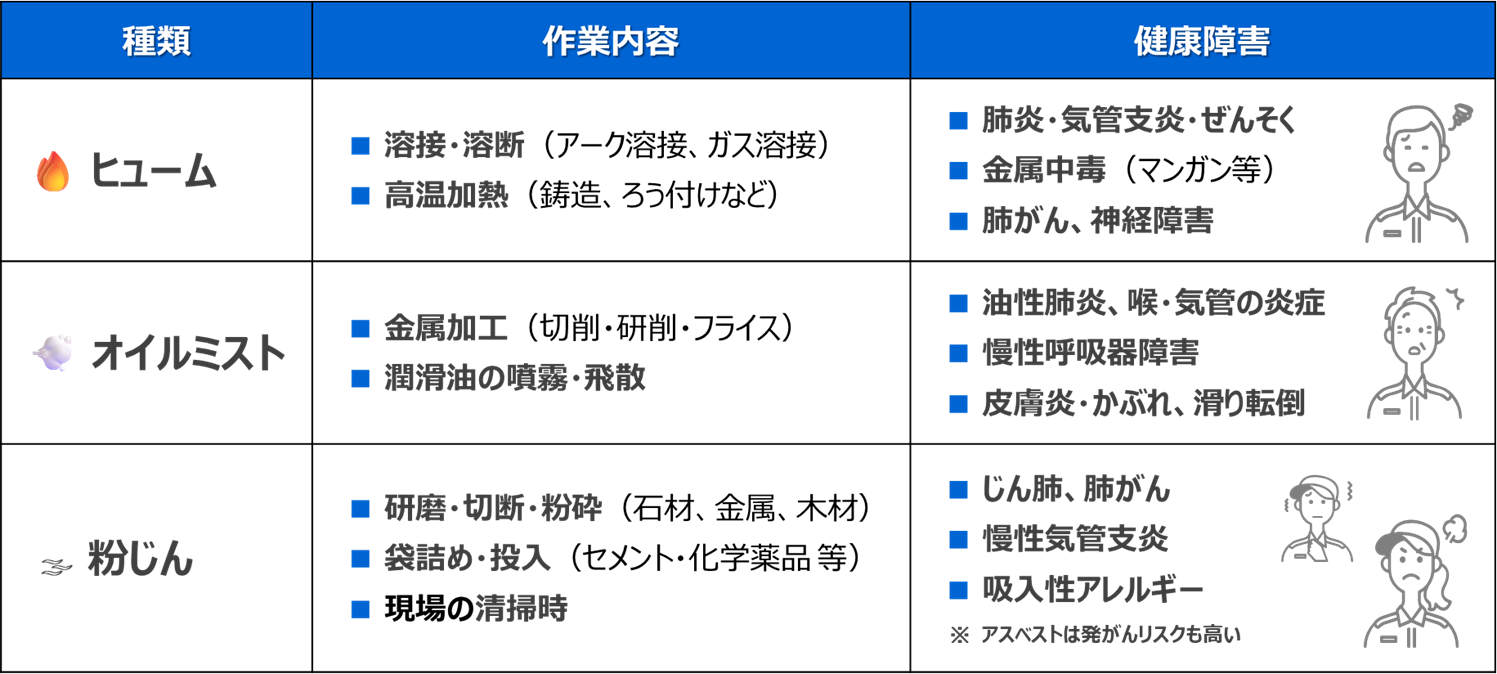 安衛法の改正により、化学物質を扱う職場の安全管理義務は拡大の一途です。特にヒューム・ミスト・粉じんなど、吸入ばく露による健康障害リスクのある物質については、 事業者に対し「確実な対策の実施」が求められています。