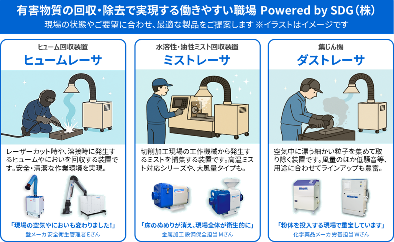こうした背景を踏まえ、職場の環境改善 と 健康障害(労災)の未然防止を目的に、ヒューム等の有害物質を効果的に回収・除去する製品提案を開始。すでに多くの事業所で採用されており、現場より高い評価を得ているものばかりです。