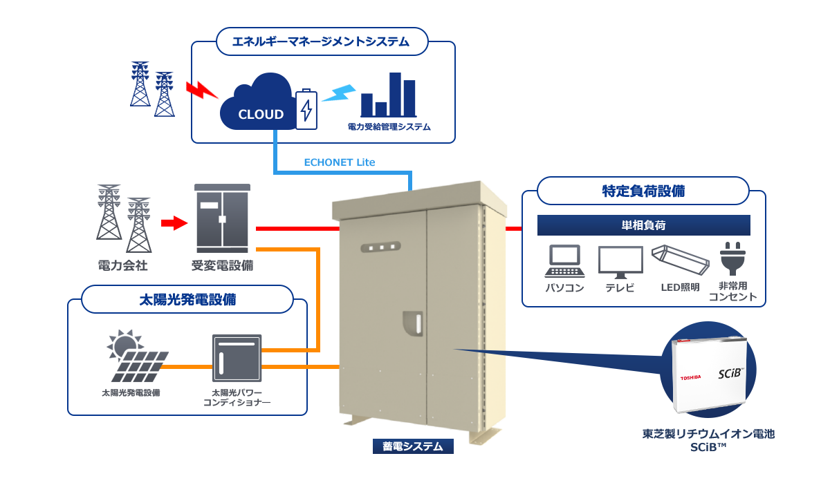 東芝 リチウムイオン二次電池SCiB™をベースとした定置型蓄電システムです。