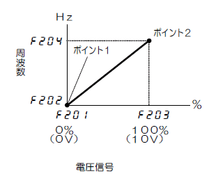 外部ボリューム(アナログ電圧入力:0-10V)で周波数を設定する場合、以下により運転周波数の特性を設定することができます。